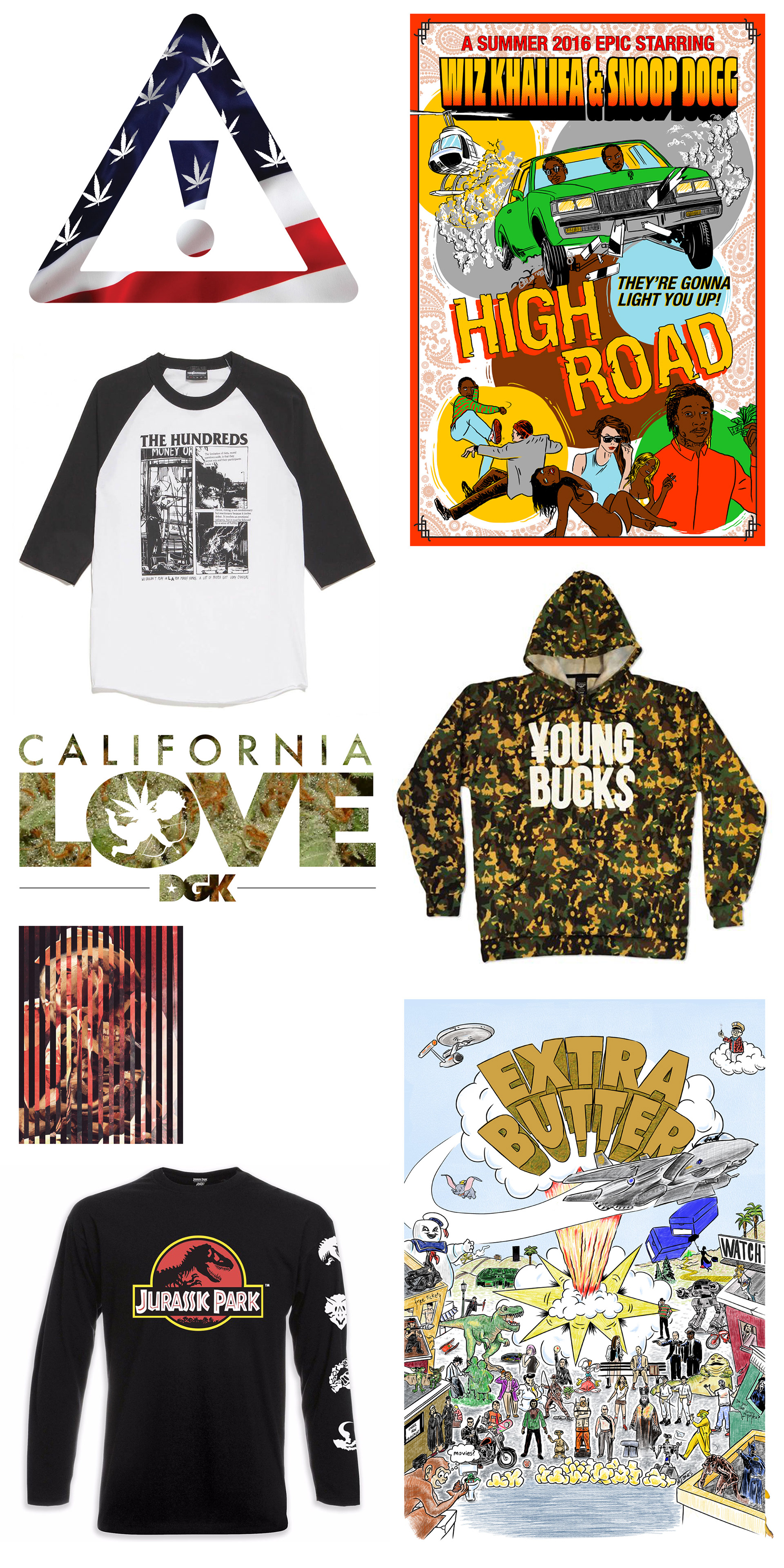 Top to Bottom: Flosstradamus, Wiz Khalifa & Snoop Dogg "High Road" tour, The Hundreds, Powerbomb x Young Bucks, DGK, 10Deep, Mondo x Jurassic Park, Extra Butter